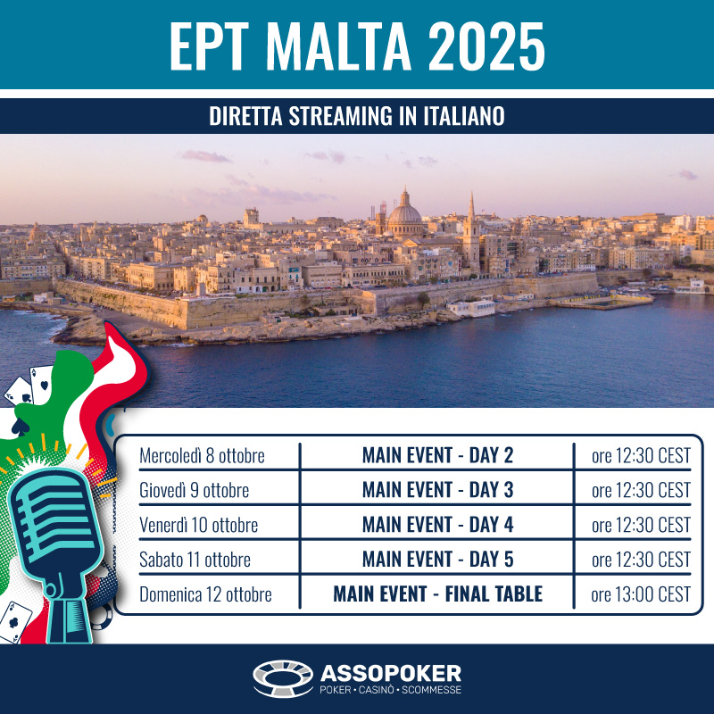 Dopo nove anni, l’European Poker Tour è tornato nel posto che si è affermato come meta imperdibile per i migliori giocatori di poker al mondo. Dalle spiagge uniche ai siti UNESCO, passando per la vivace vita notturna, l’EPT Malta 2025 è stato un evento imperdibile per professionisti e principianti. Assopoker è stato presente per documentare l’evento con resoconti, interviste e streaming in diretta.