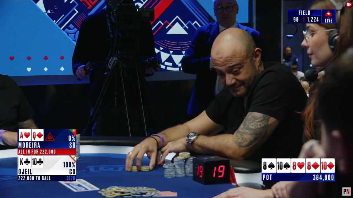 Il river 10 chiude il full sul tavolo, ma Ojeil ne nasconde uno ancora più grande. Nonostante ciò, si crea una situazione particolare, ai limiti dell'imbarazzante. Vieira fa un po' di scena, poi manda resto per 222.000 totali.