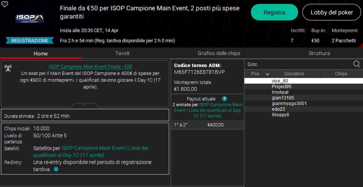 PokerStars (poker)14 Apr20:35Finale ISOP Campione Main EventFinale da €50, 2 posti + spese garantiti