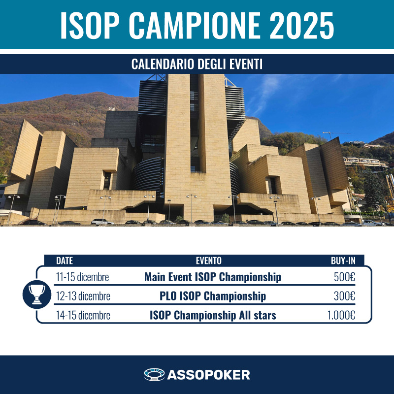 Dal 9 al 15 dicembre 2025 sono in programma, presso il Casinò di Campione, le Italian Series of Poker, comunemente conosciute come ISOP. Dopo la fortunatissima tappa di fine ottobre, i tornei low cost di ISOP sbarcano nuovamente nell'enclave italiana in terra svizzera, portando anche in questa occasione tornei e azione al tavolo verde. Assopoker sarà sul posto per aggiornare il proprio pubblico su quanto succederà a Campione.