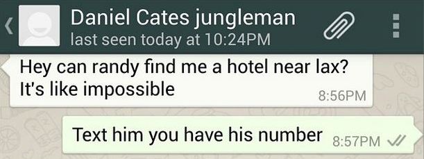Neppure due ore più tardi, però, Cates è evidentemente atterrato in aeroporto, rendendosi però ben presto conto che fosse nella San José sbagliata. In quel momento dev'essersi sentito piuttosto stupido, e non è quindi in questo genere di momenti che vuoi sbandierare ai quattro venti che cosa hai appena combinato. In questo caso però Daniel non può evitarlo, e così questa è la conversazione che segue: dapprima, "jungleman12" confessa divertito...