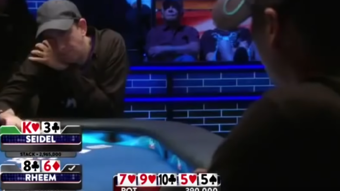 Tutti voi dovreste conoscere i protagonisti della mano che vi andiamo a proporre quest’oggi, Seidel e Rheem. Ciò che vi parrà strana è invece l'azione di Chino che mostra una carta al river. Il call è così orribile?