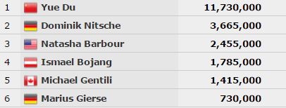 Il tavolo finale 6-handed che ripartirà domani vede il cinese Yue Du dominatore assoluto del chipcount: per lui 11.7 milioni di gettoni, più di metà di quelli in gioco. Seconda posizione per Dominik Nitsche, il più esperto tra i finalisti, che domani riprenderà le ostilità con 3.66 milioni. Seguono Natasha Barbour (come sempre supportata da Jason Mercier) e il variantista austriaco Ismael Bojang. Completano il tavolo finale il canadese Michael Gentili e il tedesco Marius Gierse: