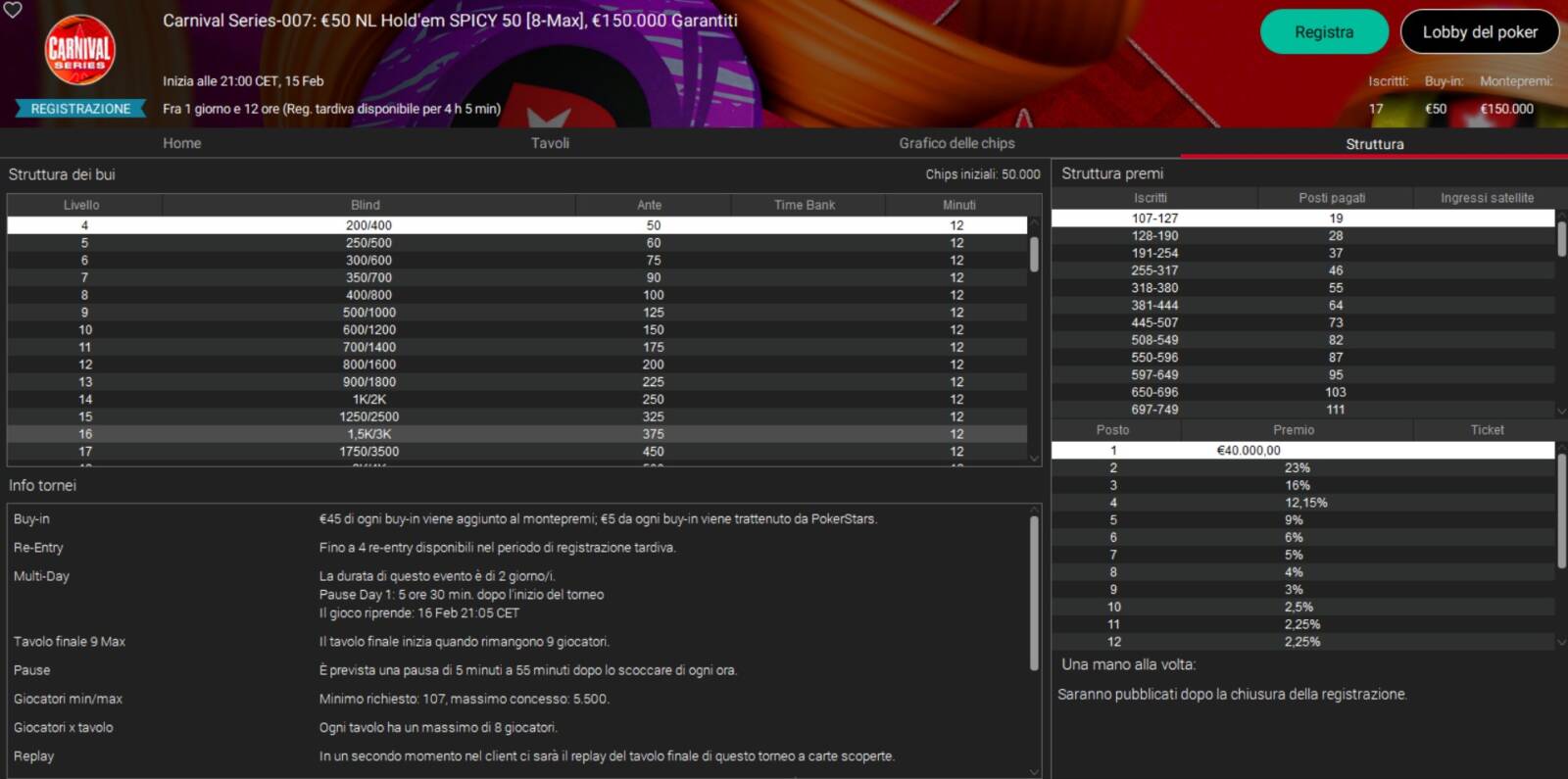 Si parte alle 21:00 CET del 15 febbraio, e la registrazione tardiva, come già scritto, resta aperta per 4 ore e 5 minuti, quindi c’è un bel pezzo di torneo in cui il field continua a gonfiarsi e i tavoli restano belli attivi.