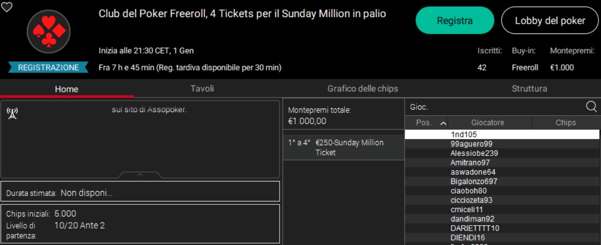 PS NETWORKgiovedì 1 gennaio 2026 21:30Club del Poker Freeroll (4 Tickets per il Sunday Million in palio)0€NLH TURBO€1.000