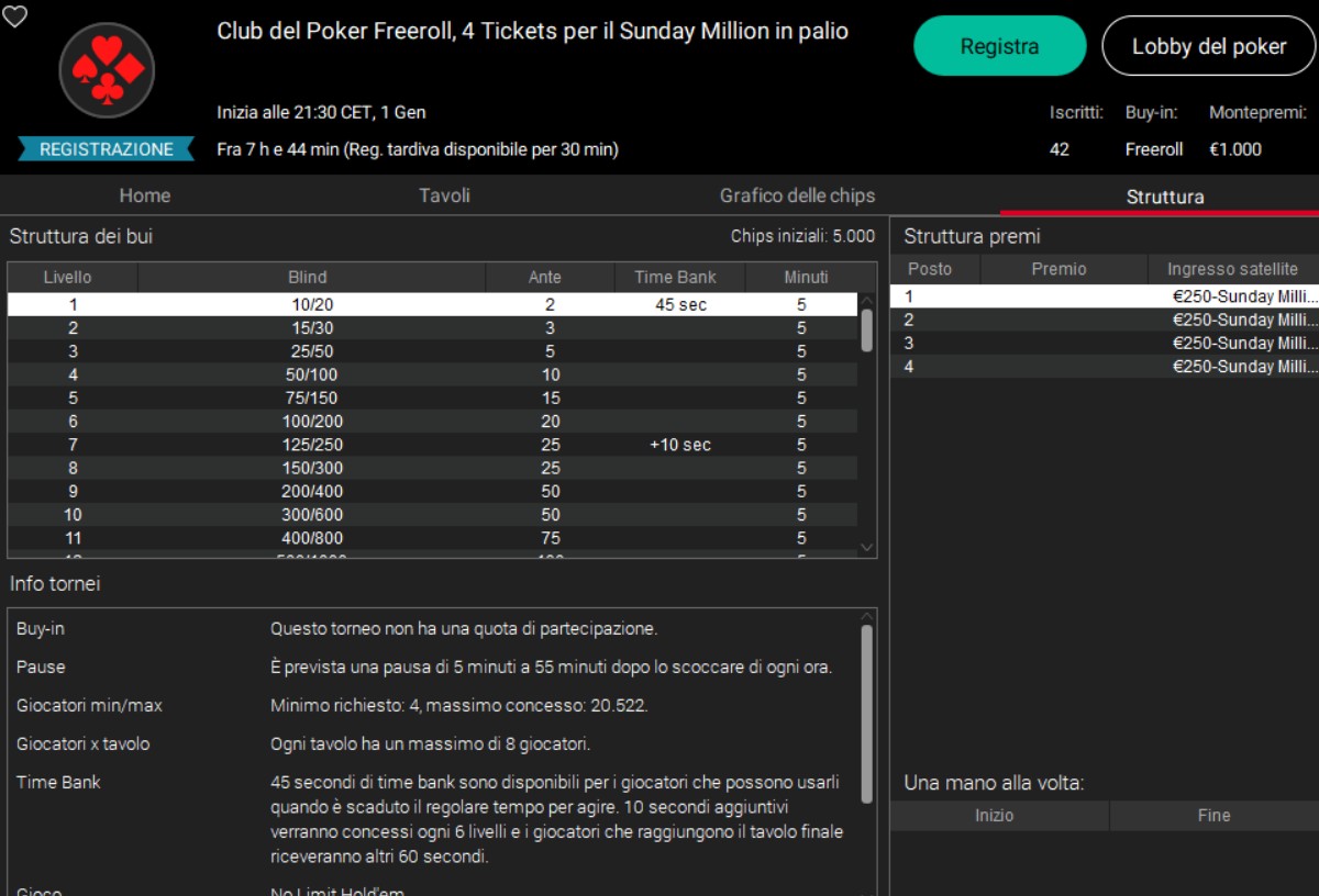 I freeroll su PokerStars e Sisal che qualificano al Sunday Million sono un'esclusiva del Club del Poker di Assopoker: si tratta di un gruppo di appassionati che durante la settimana giocano tutte le sere a dei tornei gratuiti di poker e partecipano ad eventi a loro dedicati. Per non perderne neanche uno il suggerimento è di iscriversi sia al Gruppo Facebook Club del Poker , che al Canale Telegram Club del Poker, luoghi in cui quotidianamente vengono pubblicati in anteprima tutti gli aggiornamenti a riguardo. Esiste poi una pagina riassuntiva comprensiva di tutti i tornei del Club del Poker.