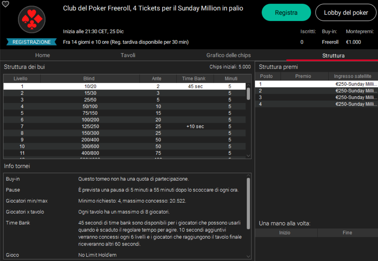 | PS NETWORK | lunedì 22 dicembre 2025 21:30 | Club del Poker Freeroll (4 Tickets per il Sunday Million in palio) | 0€ | NLH TURBO | €1.000 |