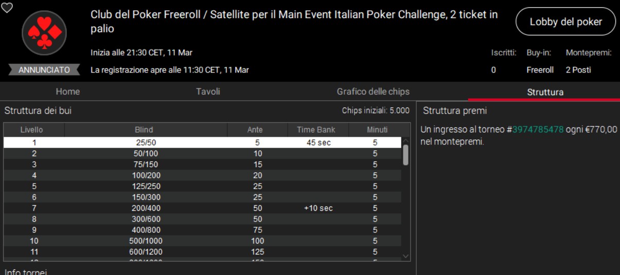 Trattasi di un satellite che troverete esclusivamente sulla lobby freeroll di PokerStars, ma prima di iscrivervi dovrete sempre e comunque passare sulla pagina del Club del Poker, attraverso la quale riceverete la password per potervi iscrivere al torneo.