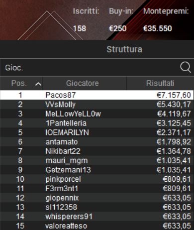 Tra i primi 23 che hanno piazzato la bandierina virtuale, l’ha spuntata “Pacos87”, primo per €7.158 dopo un HU vinto contro "VVsMolly". I due non hanno raggiunto alcun deal.