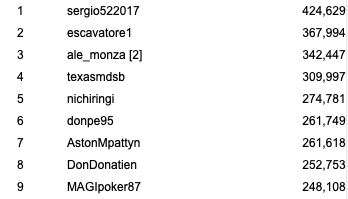 Ci limiteremo a segnalare il secondo classificato “devvvid” per €4.375 e il terzo, “gianlu123”, per €3.289.