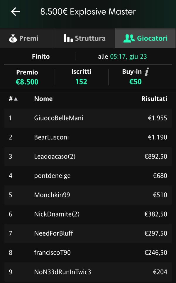 Chiudiamo la parte riguardante iPoker con l'Explosive Master, 50€ di buy-in e 8.500€ garantiti. 152 sono stati gli iscritti questa volta, nella quale è emerso vincitore il regular "GiuocoBelleMani" per un premio da 1.955€: