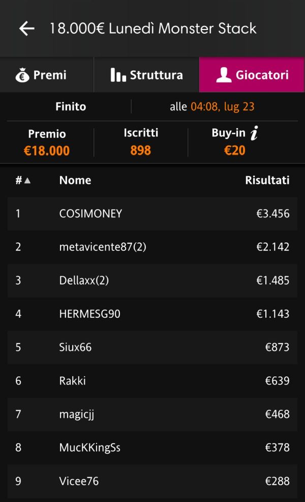 Stesso buy-in per il Lunedì Monster Stack, sempre da 20€ e con 18.000€ garantiti a montepremi. Leggero calo per gli iscritti, fermatisi a quota 898, ma questo non importa molto a "COSIMONEY", che si è messo tutti alle spalle per un incasso da 3.456€: