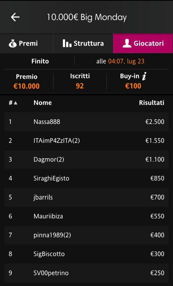 Chiudiamo, come al solito, con il Big Monday da 100€ e 10.000€ garantiti. Questa settimana, la ribalta è toccata a "Nassa888", capace di prevalere sui 92 iscritti e incassare 2.500€ tondi tondi: