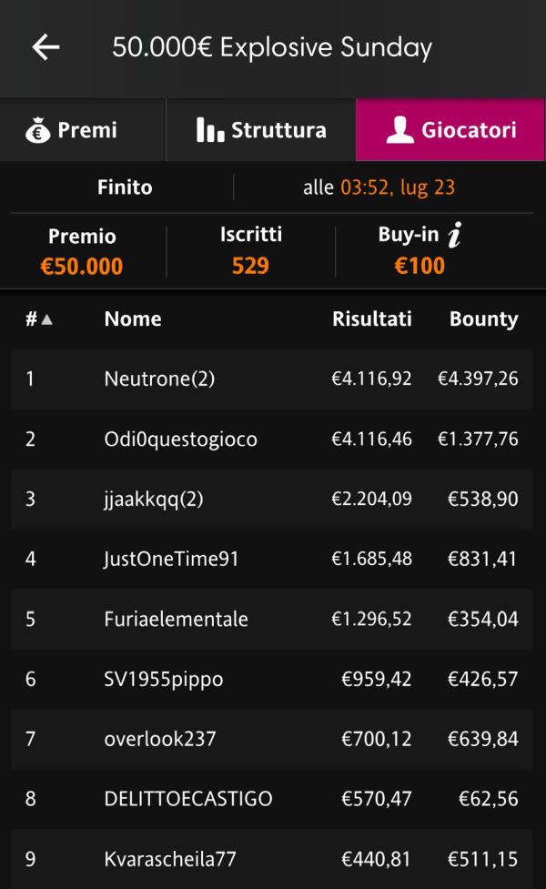 Si è dovuto attendere quasi le 4 del mattino, per conoscere il nickname del vincitore, e si tratta di un nickname quanto mai azzeccato per il nome del torneo: "Neutrone". Questo player ha dovuto fare ricorso all'unico re-entry consentito dal torneo, ma ne è valsa la pena, visto che la vittoria gli ha portato ben 8.514€ sul conto. Sconfitto in heads up "Odi0questogioco", che può momentaneamente mettere da parte i cattivi sentimenti a fronte di un guadagno da quasi 5.400€.