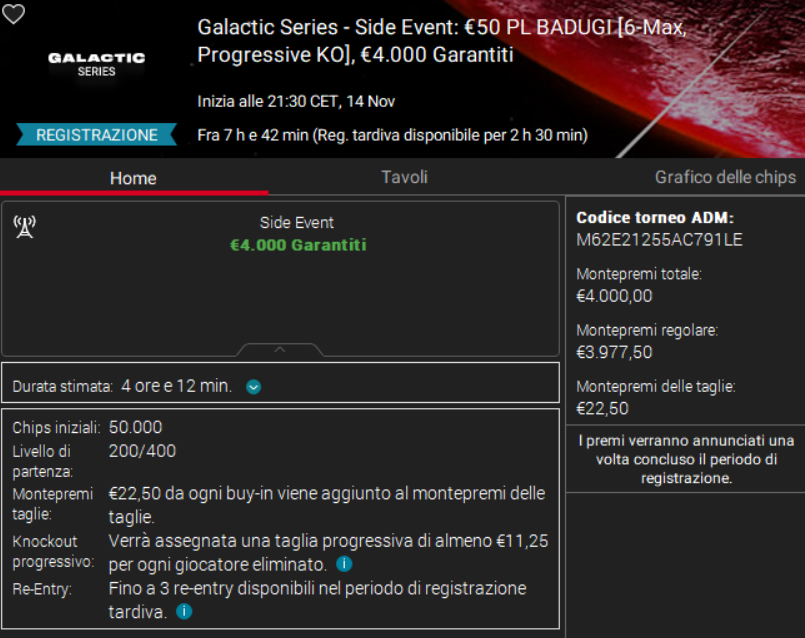 È garantito comunque un ritorno minimo di 11,25 € per ogni knockout. Il torneo consente fino a 3 re-entry nel periodo di late registration, dettaglio importante sia per chi vuole prendersela comoda e “osservare” i tavoli nelle prime fasi, sia per chi magari si gioca qualche spot borderline sapendo di poter tornare in corsa.