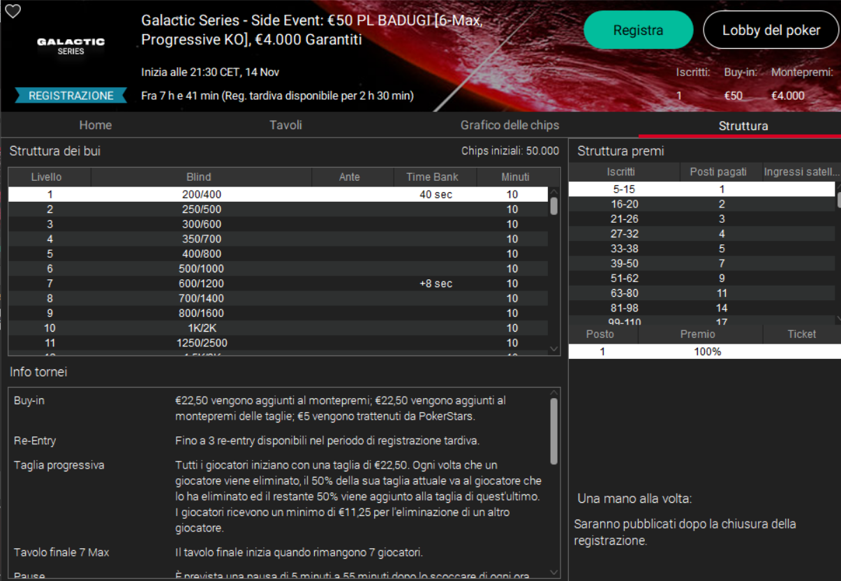 Il buy-in è di 50 € e segue la classica ripartizione dei Progressive KO di PokerStars e Sisal: 22,50 € finiscono nel montepremi “regolare”, altri 22,50 € alimentano il montepremi delle taglie, mentre 5 € vengono trattenuti dalla room a titolo di commissione.