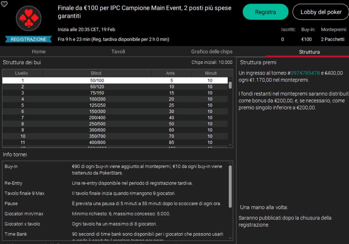 | 22 Feb 20:35 | Finale da €100 per IPC Campione Main Event — 2 posti + spese garantiti |