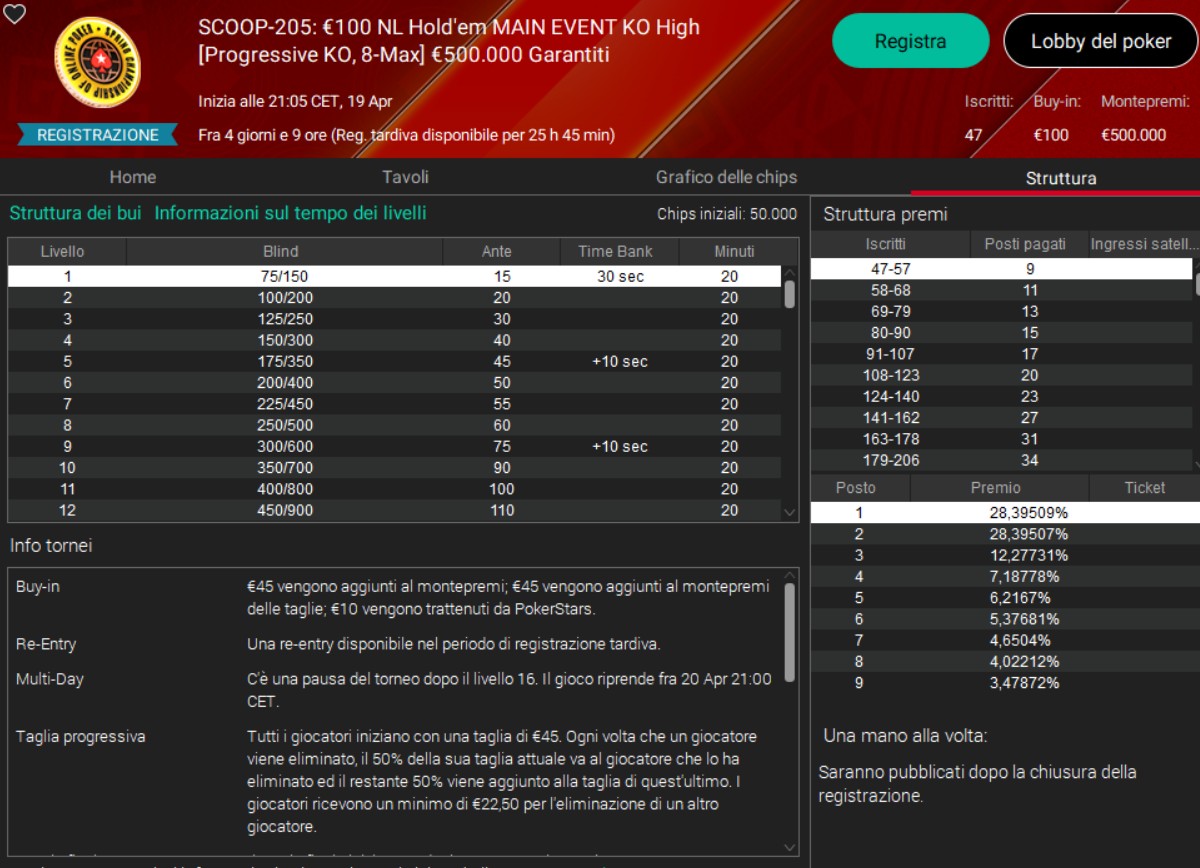 Un altro elemento molto importante è la gestione temporale del torneo. La registrazione tardiva resta aperta per 25 ore e 45 minuti, con la possibilità di effettuare un re-entry durante questo periodo, e il torneo è impostato in modalità multi-day, con una pausa dopo il livello 16 e la ripresa del gioco nella serata successiva.