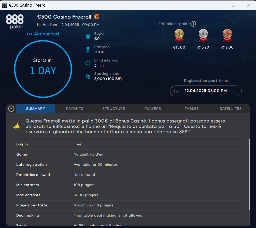 Per giocare questo torneo gratis serve un conto gioco attivo su 888 (poker).