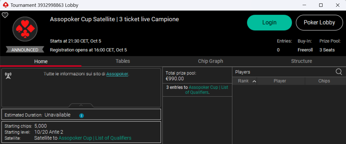 Il freeroll 'Assopoker Cup Satellite' inizia domenica sera alle 21:30 e mette in palio tre ticket da 330€ per un montepremi garantito complessivo di 990€.