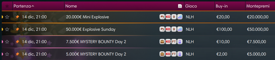 Qui gli appuntamenti imperdibili sono quelli tradizionali: il 100€ Sunday Special 125.000€ grt in partenza alle ore 21:00 e il 250€ Sunday High Roller 30.000€ grt delle ore 22:00.