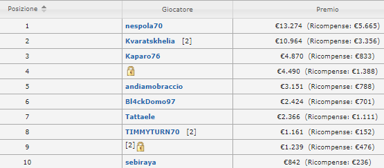 Vi abbiamo parlato ieri del Garantito da €12.500 superato da quello effettivo da €13.140 e nella notte la vittoria è andata a "hapachaviv", che ha messo tutti dietro per un premio di €3.004 Dietro di lui "ANTONY51" per un premio di €2.144.