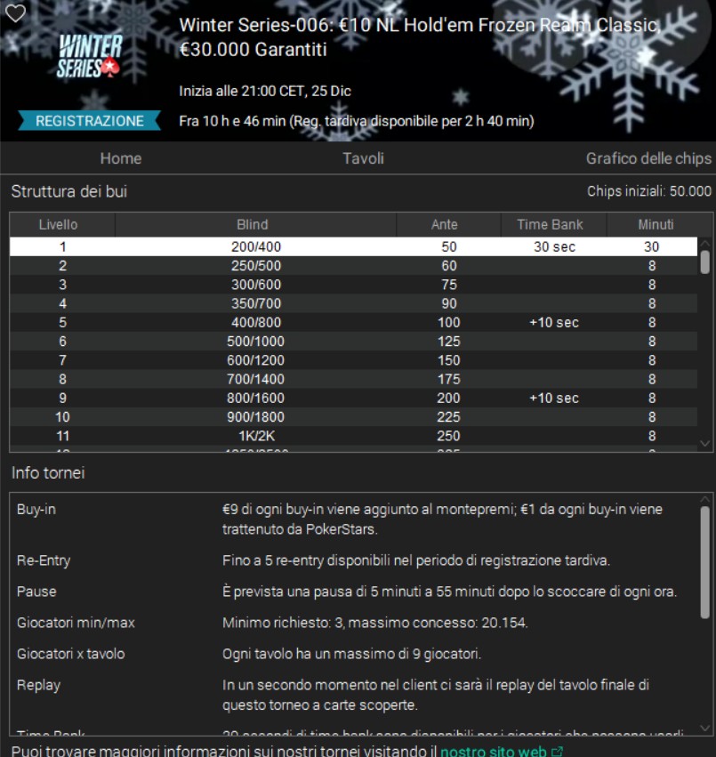 €10 NL Hold’em, €30.000 garantiti, 50.000 chips iniziali, bui 200/400 ante 50, late reg 2h40 con fino a 5 re-entry.