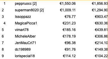 Dietro di lui “liuk899” e “MassimoDii”, rispettivamente secondo e terzo per €1.136 e €859.