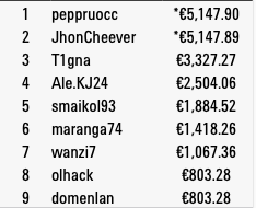 Facce conosciute occupano i primi due posti del Payout ufficiale: Salvatore “totosara_93” Saracino e Riccardo “Overbet91” Bonelli si sono divisi primo e secondo premio e lo hanno fatto da buoni fratelli con un deal puro al 50%.