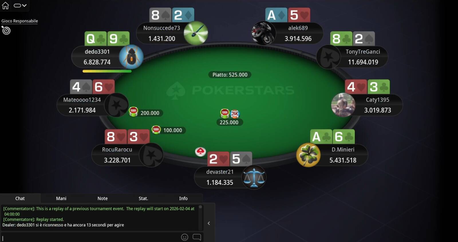 Sempre su blinds 125k/250k, 'Nonsuccede73' con 1,25 blinds di stack openlimpa 10 6 da cutoff e poi chiama il push di 'TonyTreGanci' da bottone. Il chipleader si presenta a showdown con 9 9 e su board liscio vince una taglia minima di 16,50€ giusto prima del level-up.