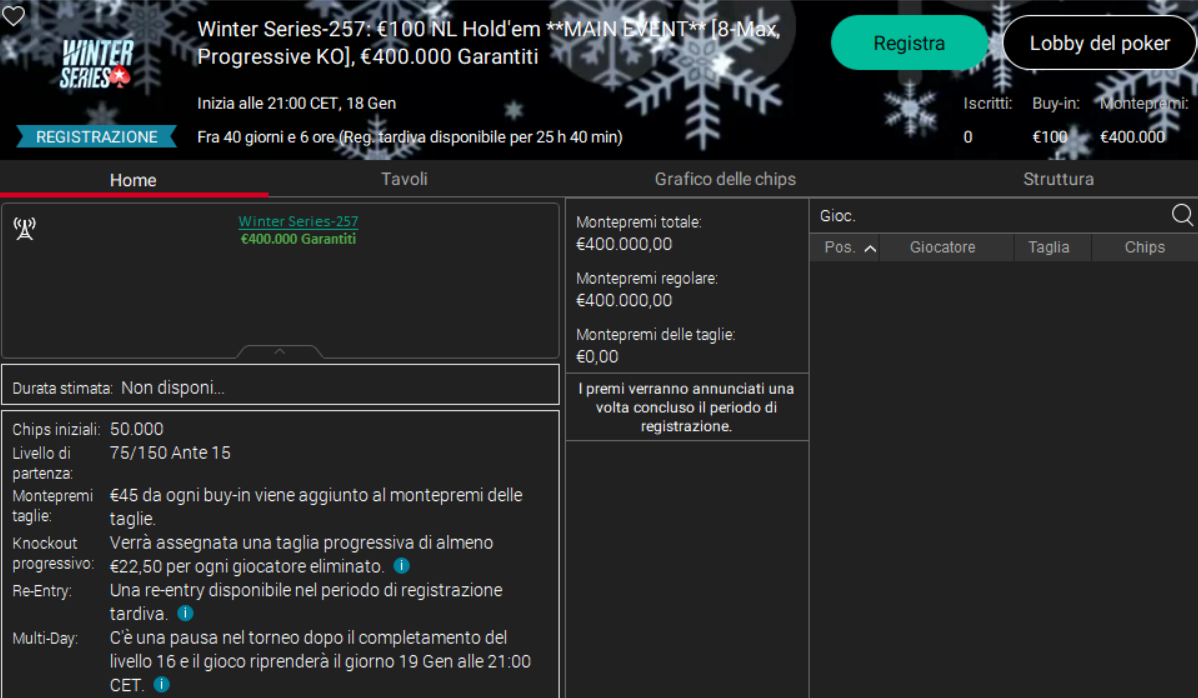 Come scritto si gioca con un costo di iscrizione da €100 e €400.000 di montepremi garantito, verrà disputato con la formula Progressive Knock Out e la registrazione tardiva durerà qualcosa come 25 ore e 40 minuti, visto che sarà un evento da due giorni, il cui Day 2 di aprirà nella serata di lunedì 19 gennaio alle 21:00.