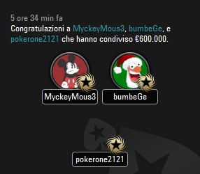 Flash News - Stanotte su PokerStars.it, il player italiano MickyMous3 ha vinto uno Spin & Go con un super jackpot da €600.000, pagando €50 di buy-in. E' probabile che si tratti di un regular essendo il livello della quota di iscrizione molto alto.