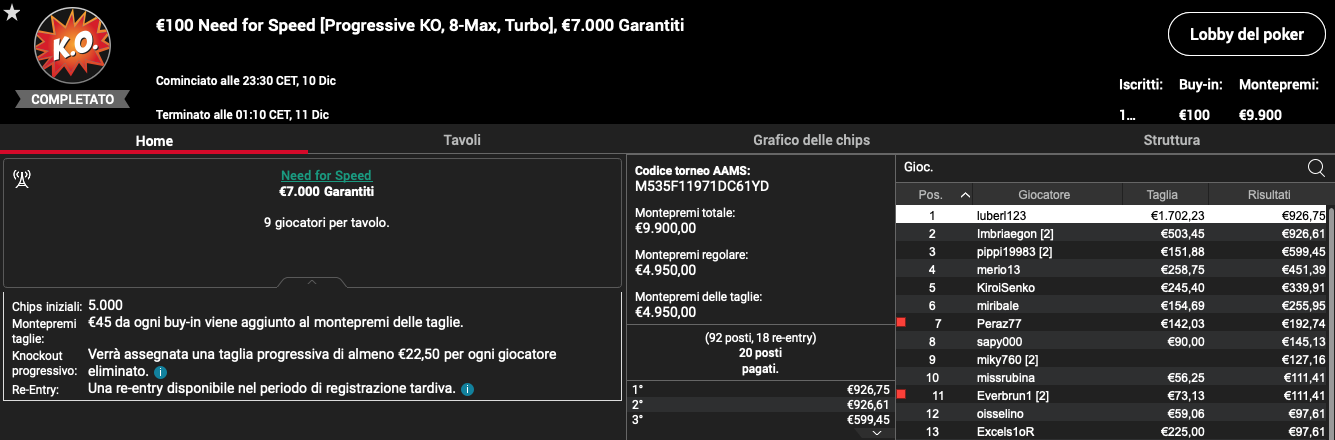 Tale numero di iscritti ha generato un montepremi di €6.840 suddiviso sulla base di 13 posti pagati, per un totale complessivo di 6 re-entry effettuati dagli iscritti.