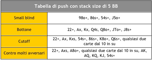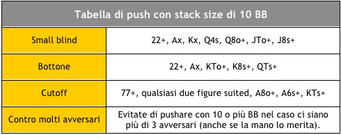 Nell’appendice B del libro Sit’n’Go Strategy di Collin Moshman, l’autore riporta alcune tabelle di push per stack pari a 3, 5, 7 e 10 BB relative alle posizioni di small blind, bottone, cutoff oltre al caso in cui ci siano ancora diversi avversari che devono agire.