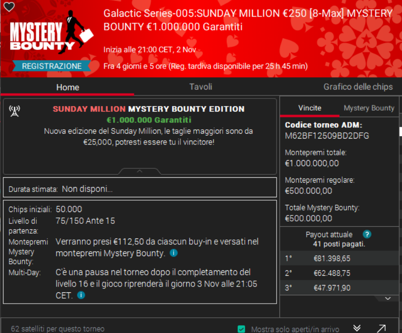 Il Sunday Million è il torneo perfetto anche per chi gioca saltuariamente: hai tempo per pensare, puoi impostare con calma la serata e – novità che fa gola a tutti – le taglie misteriose arrivano a 25.000€.