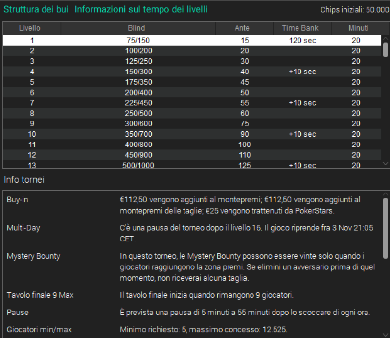 Si parte 75/150 con ante 15 e 50.000 chip: più di 300 big blind iniziali. I livelli sono di 20 minuti e il time bank è generoso. Questo significa che non devi correre, né improvvisare. Dopo il livello 16 c’è la pausa lunga: si riprende il 3 novembre alle 21:05.