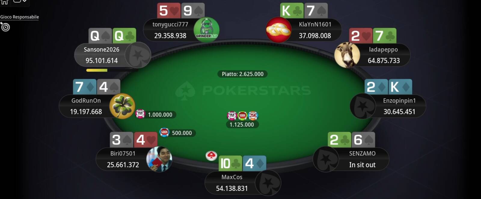 In testa al count di fine giornata, "mongiokami72" guarda tutti dall'alto delle sue 827.794 chips. A seguire "Littleitaly1989" a quota 724.316 e "CryZyrc", 712.813.