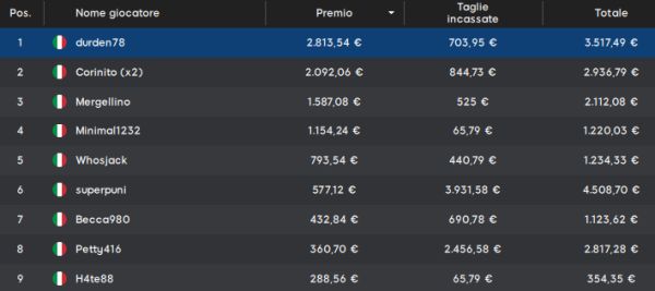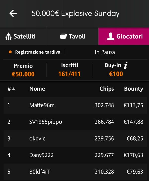 Non cambierà invece il chipleader, che è - e anche in maniera molto netta - il giocatore "Matte96m", che ha chiuso il day 1 a 302.478 gettoni virtuali, oltre a 113€ in taglie già incassate.