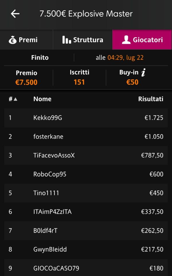 Chiudiamo il discorso relativo a iPoker con l'Explosive Master, torneo da 50€ con 7.500€ garantiti e 151 iscritti in questa edizione. Stavolta il primo piano è per "Kekko99G", che ha guadagnato 1.725€ per i suoi sforzi: