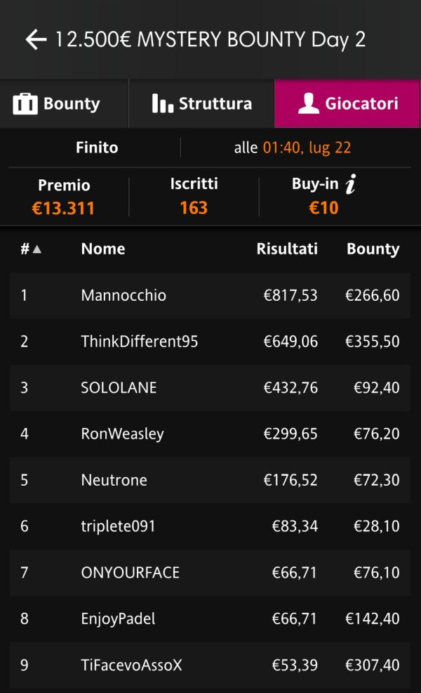 Sospeso - forse per pausa estiva - il torneo da 50€, quello da 10€ con 12.500€ garantiti continua a centrare buoni numeri. 163 i qualificati al giorno finale, tra i quali è emerso infine "Mannocchio", per un premio totale da da circa 1.084€. Buono, ma inferiore a quanto incassato da altri player, come il 24° classificato "1011giocatori", che solo di mystery bounty ha incassato 1.378€. Per quanto riguarda il final table, trovate tutto nello screenshot: