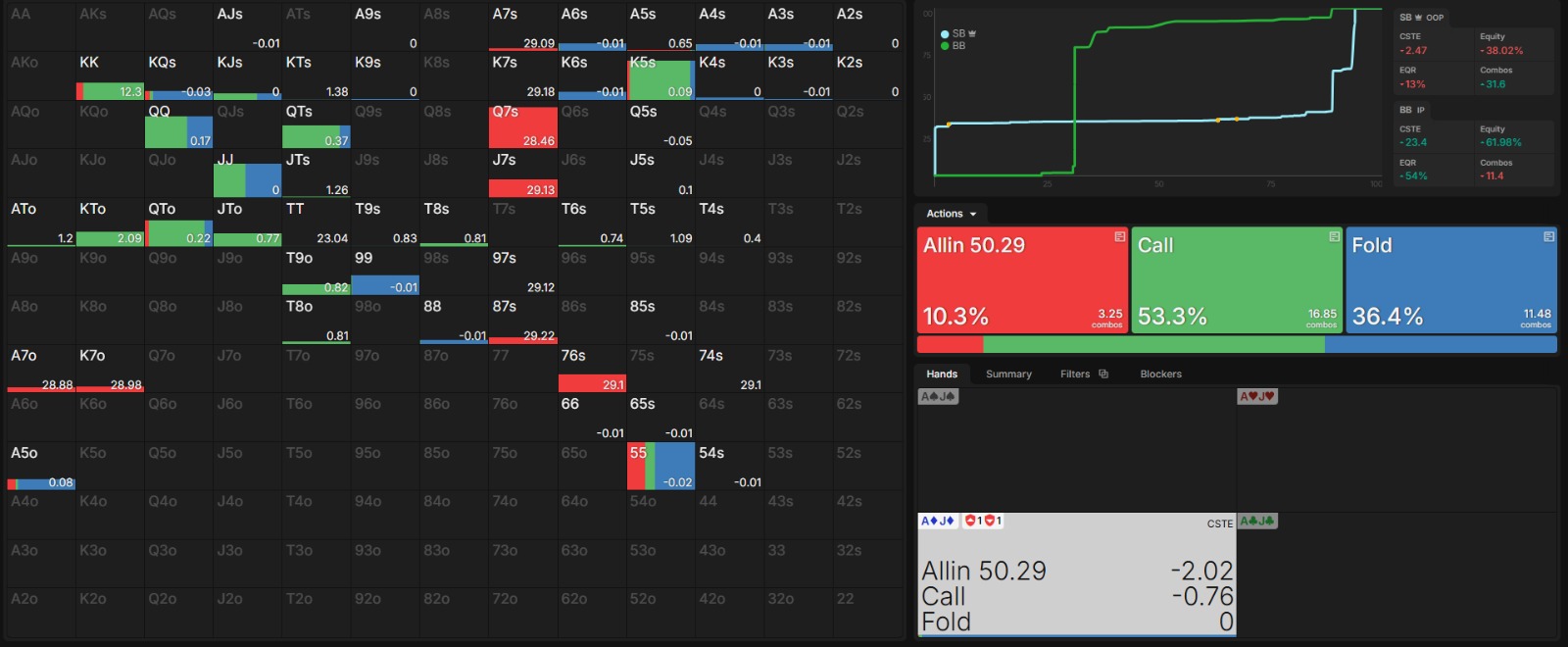 In game ho avuto molti dubbi, ho pensato molto sul da farsi e alla fine ho optato per il push visto che qua comunque ho sicuramente dei bluff che gioco così, pensavo anche mani come 98 o roba di questo tipo. In realtà il Solver prende come main bluff i gutshot più bassi, tipo 64, roba molto piccola di porzioni di frequenza e molto molto bassa che non blocca neanche il suo continuing range fino al river.
