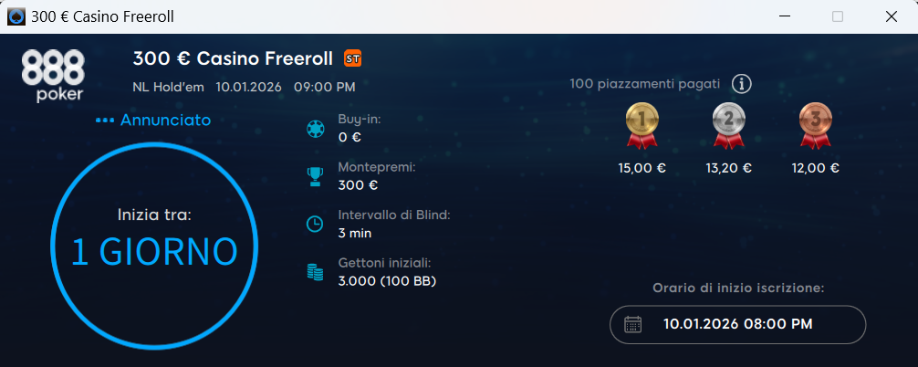 Su 888 l'appuntamento coi tornei gratis del week-end è per le ore 21:00 di sabato sera, quando avrà inizio il Casino Freeroll che mette in palio 300€ bonus per la casa da gioco di 888.