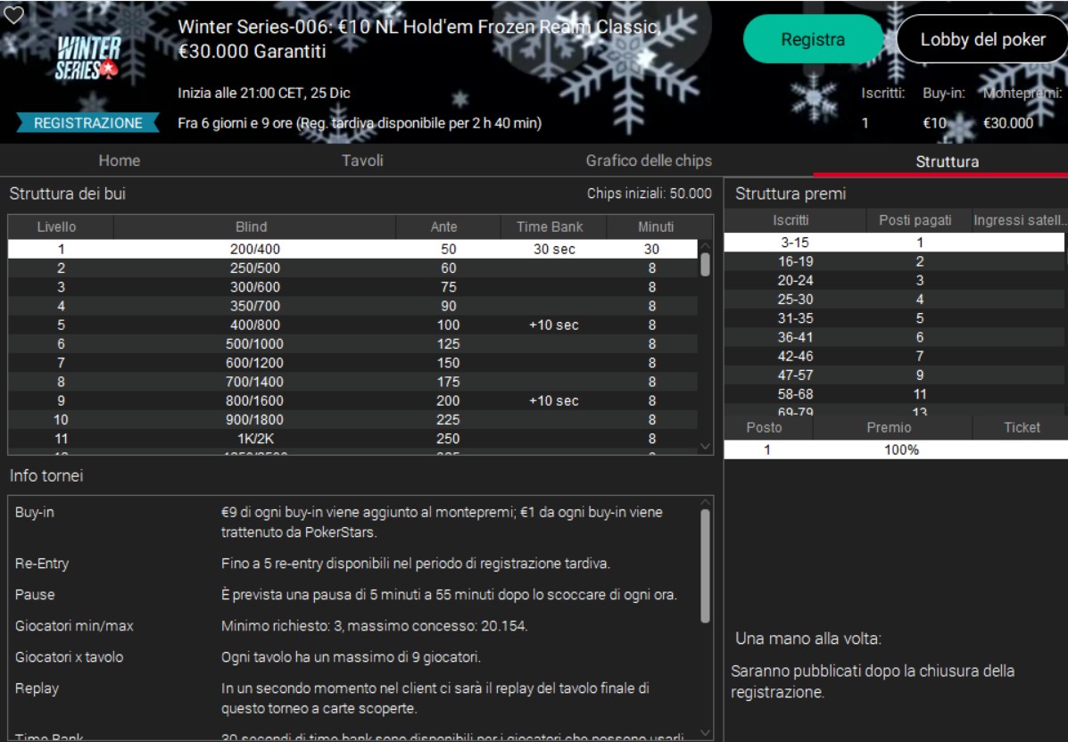 Il Winter Series-006: €10 NL Hold’em Frozen Realm Classic si piazza perfettamente nello spirito delle Winter Series su PokerStars e Sisal: buy-in popolare, struttura pensata per far giocare tanta gente e, soprattutto, un montepremi garantito da €30.000 che alza subito l’asticella dell’interesse.