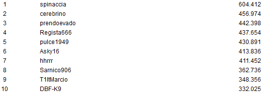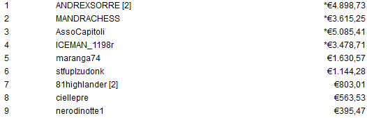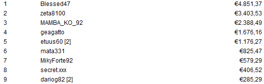Il giocatore che ha accumulato la cifra più alta con le taglie è "Terremotat", decimo ma già vincitore di almeno €1.047. La prima moneta è fissata in €45.279 e questa è la top 10: