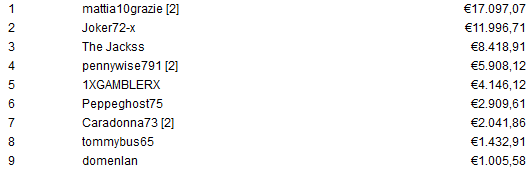 Nella top 10 troviamo il noto regular degli MTT Online .it Eugenio "Eugol93" Sanchioni (5°) ma scorrendo il chipcount non mancano altri professionisti come Federico "IFOLDACES4U" Piroddi (20°), Antonio "A.Bernaudo" Bernaudo (25°), Giacomo "James90511" Grossi (28°), Roberto "DrunkSpewer" Morra (42°), Nicolò "ChallengerGX" Ceccarelli (49°), Guido "POGGIAIOLO" Pieraccini (76°) e Andrea "ANTIREGS87" Crobu (96°).