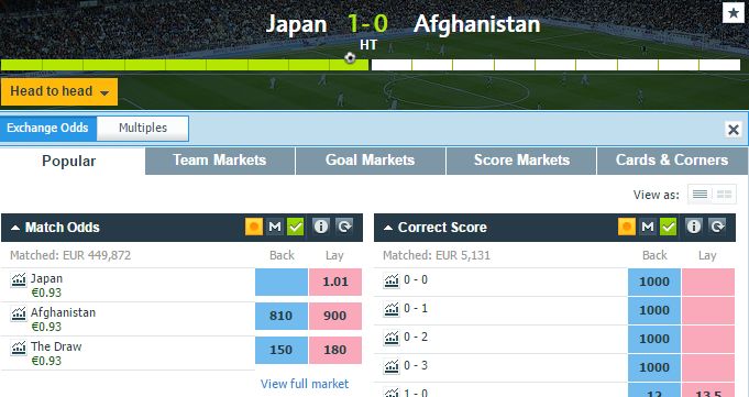 L'Afghanistan regge nei primi minuti, al 15' le quote ci portano in parità e al 17' abbiamo già un profitto di 1€ (0,95€) senza dover rischiare. Il nostro piano iniziale prevedeva di puntare quando la quota fosse salita a 1.05 ma i nipponici stanno assediando la porta avversaria. Non c'è storia.