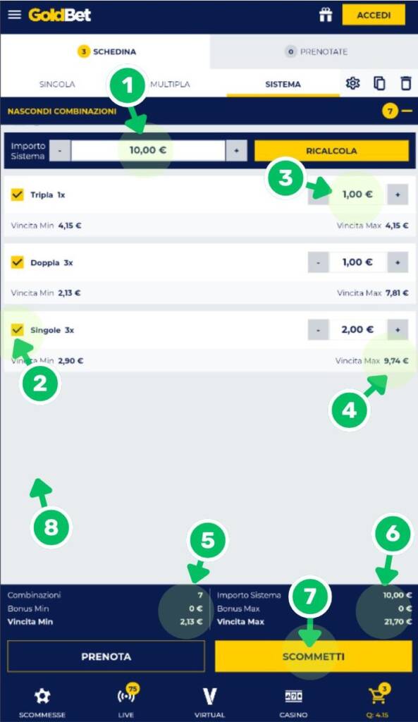 - 7. Scommetti - Quando avrai effettuato tutte le scelte sul sistema, non ti resta che cliccare su questo tasto per finalizzare la puntata