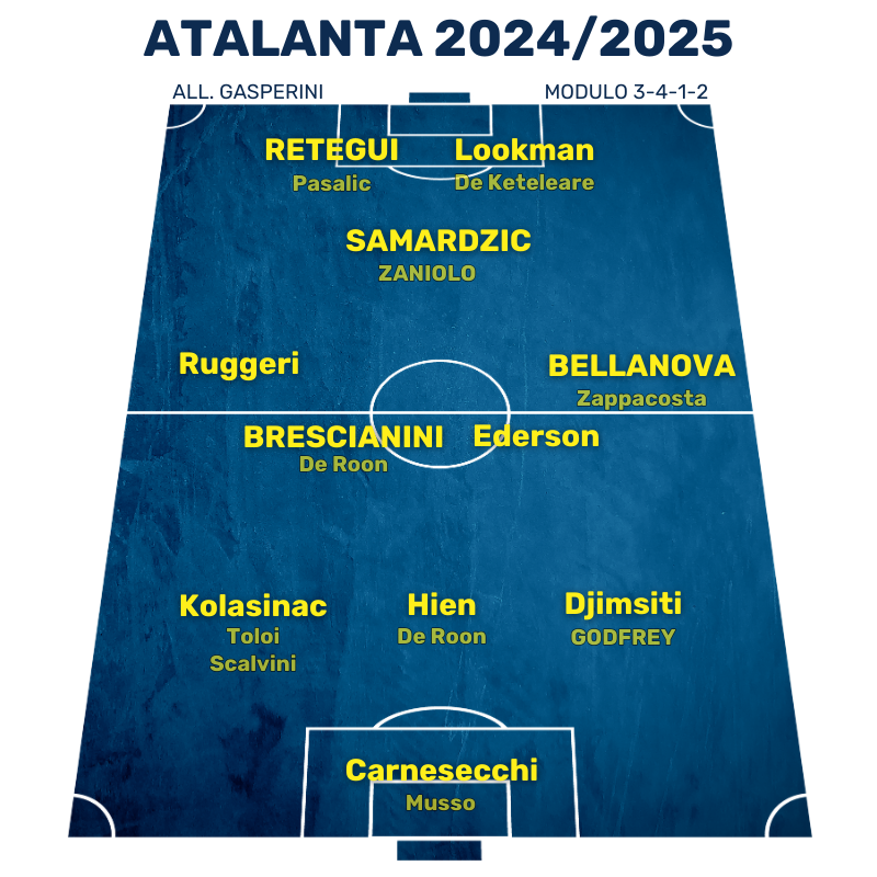 Ogni anno si pensa che l'Atalanta di Gasperini abbia dato il massimo nella stagione precedente. E puntualmente, la Dea ci stupisce con una stagione formidabile. Dopo essere diventati Campioni d'Europa dopo la mitica serata di Dublino, gli orobici legittimamente vogliono tentare il colpaccio anche in campionato, e si candidano tra le favorite della Serie A. Forse questa è la squadra che a livello di calciomercato ha lavorato meglio: dopo l'infortunio di Scamacca è arrivato Retegui per l'attacco, che dovrebbe far coppia con Lookman (che dovrebbe restare, nonostante le sirene francesi). Sulla trequarti, non bastava il colpo Zaniolo: è arrivato pure Samardzic, a dare ulteriore qualità al reparto. Bellanova è chiamato sulla destra ad un super lavoro in alternanza con Zappacosta, e Brescianini è un jolly poliedrico.
